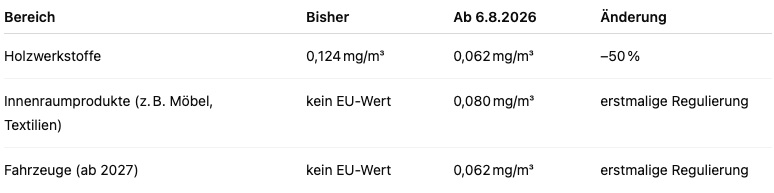 Bereits heute gelten nationale Vorgaben: Holzwerkstoffe dürfen 0,1 ml/m³ (≈ 0,124 mg/m³) nicht überschreiten. Dieser Wert wurde z. B. im Mietrecht oder bei Immobiliengutachten als Maßstab genutzt.